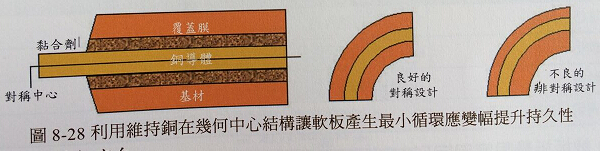 几何中心的观念对FPC相当重要,理论上任何结构的中心位置在弯折时都几乎保持在不动的状态,这样应力就都被外部层材料所吸收。因此,如果铜薄膜是保持在设计的中心,挠曲寿命应该都可以提升,如图8-28所示。