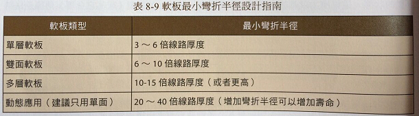 利用有限元素分析可以模拟预估建议的弯折极限,有一些普遍使用的指南可以做为参考。对一般软板弯折,设计可以参考表8-9的数据。对于非常高挠曲寿命的动态FPC设计,利用制造测试样品来验证还是比较倾向使用的方式。