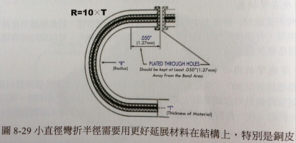 一般会建议设计者提供最大的工作半径给弯折区,这个设计对于动态FPC特别重要,这方面已如前述。而这种概念在静态的FPC应用方面也相对重要。图8-29所示,为一般性弯折半径与FPC厚度的关系。弯折半径对铜皮的影响而言,可以明显看到当挠曲半径减少时,外边所产生的铜皮延长量会增加。