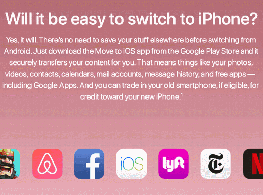 苹果:“我们早就在Google play上架了数据转移APP,你在安卓设备上的任何信息都能快速且安全的转移到iPhone上”。