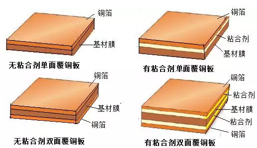 (1) 挠性覆铜板(FCCL):按照一面覆盖铜箔或两面覆盖铜箔之区别称为单面覆铜板、双面覆铜板;按照铜箔与基材膜之间有无粘合剂之区别称为有胶覆铜板、无胶覆铜板。挠性覆铜板之结构如图3。挠性覆铜板的基材膜常用的有聚酰亚胺(PI)、聚酯(PET)、聚2,6萘二甲酸乙二酯(PEN:)、液晶聚合物(LCP)等高分子薄膜。覆铜板在整个印制电路板上,主要担负着导电、绝缘和支撑三个方面的功能。印制电路板的性能、质量、制造过程中的加工性、制造成本、制造水平等,在很大程度上取决于覆铜板的性能。