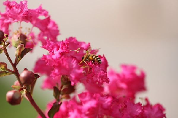 紫薇花虽然没有月季的的姿态、没有桂花的清香、也没有牡丹的华贵。但它也有自己的风格,雅而不俗,花香虽不扑鼻,但淡淡的香味却能让人回味无穷。这栽种在生活区让整个环境都美美哒!车间也更加地bulingbuling了!紫薇花的花语是:沉迷的爱、好运。这不连蜜蜂、蜻蜓都来撩了……