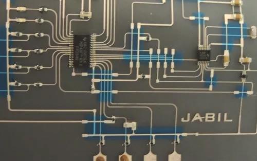 Jabil展示柔性的塑料电路板,使用印刷在柔性基板上的导线和电路,以及安装在其上的超薄型芯片。