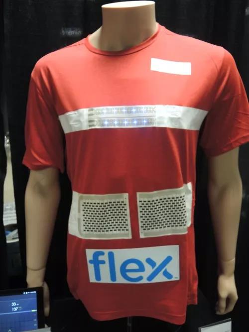 合约制造商Flex展示一款带ECG传感器的加热运动衫,其中编织进柔性照明和加热组件。这种柔性加热组件也已经开始用于汽车后视镜和滑雪护目镜了。