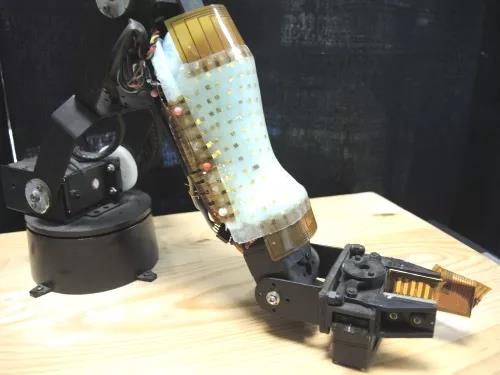 美国史丹佛大学学生展示一款包覆一连串传感器的机器手臂,使其得以在行进中进行侦测与避开物体。