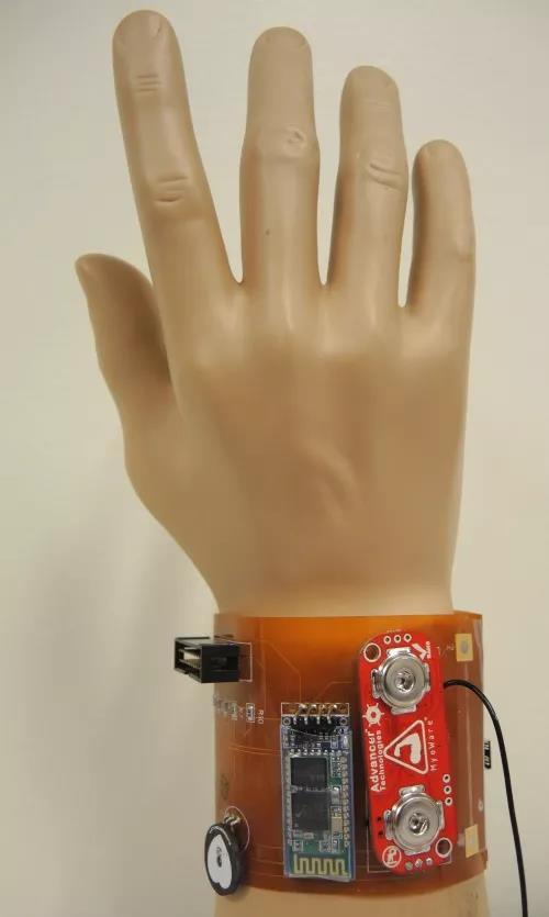 Auburn展示一款安全腕带,可用于监测在危险情况下工作的人员。目前的设计采用聚酰亚胺基板,但该团队也正研究如何在其它塑料基板上使用增层印刷以利电路布局。