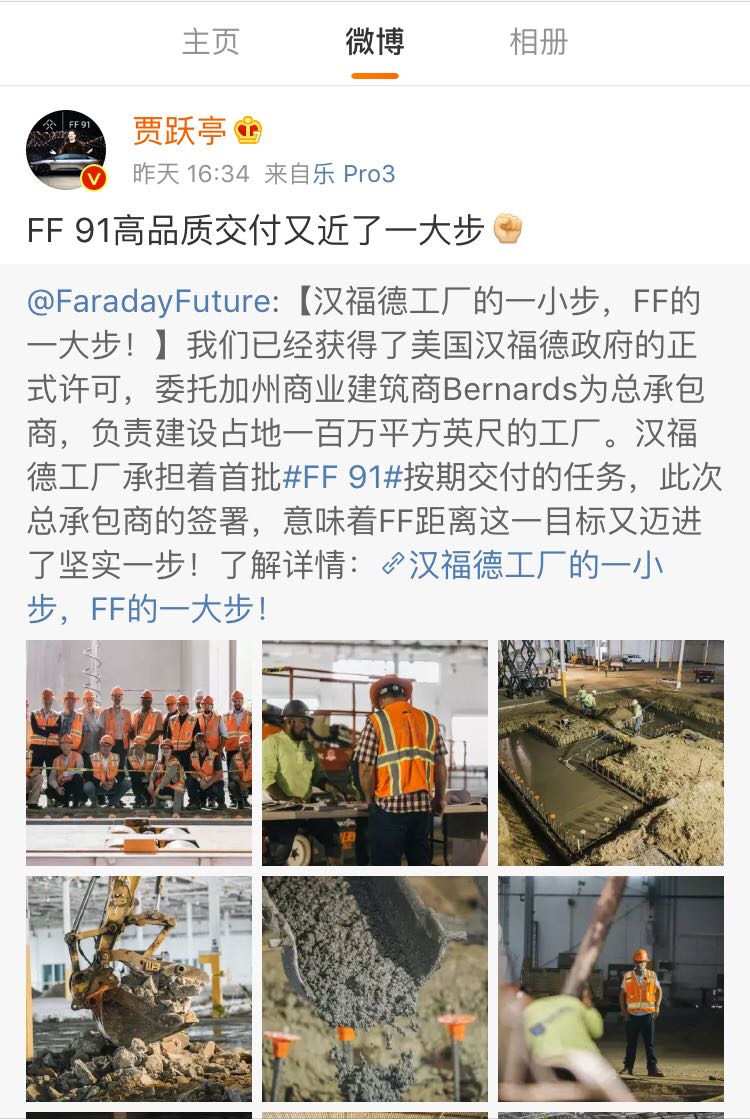 贾跃亭的造车梦要实现了?据汽车FPC小编悉, 6月8日消息 贾跃亭在微博发消息称,距离FF 91高品质交付又近了一大步。据介绍,FaradayFuture(简称FF)已经获得了美国汉福德当地政府的正式许可,委托Bernards为总承包商,将负责建设占地一百万平方英尺的FF汉福德工厂。