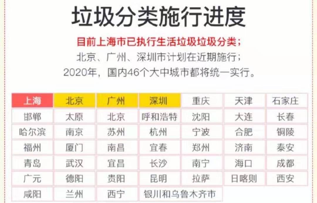 到 2020年底,先行先试的46个重点城市基本建成垃圾分类处理系统。2025年前,全国地级及以上城市要基本建成垃圾分类处理系统。来看看有没有你的城市。