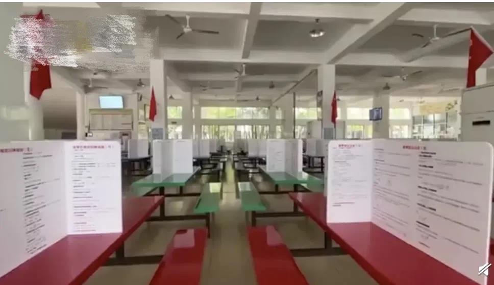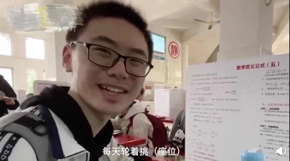 请注意这可不是普通的隔板,上面满屏都是高考知识点!该校老师介绍,这里每个学科都有,语数外较多,物化生政史地则按比例平均分配。有的同学表示这种隔板非常好,每天吃饭都轮着挑座位。