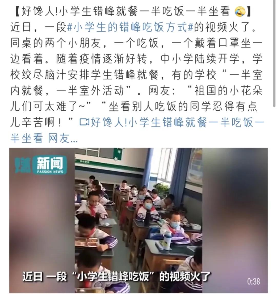当天,还有这么一所学校也火了。视频显示,这家小学推行错峰吃饭,一半孩子先在吃饭,而另一半孩子则佩戴好口罩,双手放在桌子上坐好。小朋友,你是否有很多问号??为什么别人都在吃饭,我却只能看着……