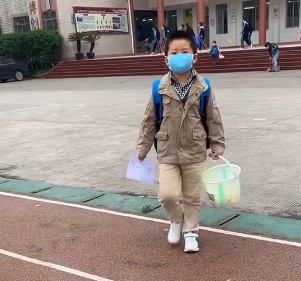 4月13日,四川武胜沿口小学开始复学复课,在这天早上,一位背着书包的小男孩拎着桶来到学校报到。