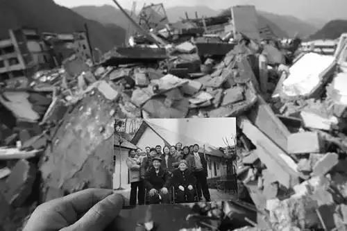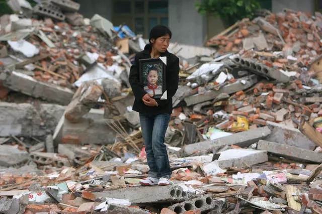 ▲2008年5月22日,母亲在废墟上捧着儿子的遗照。