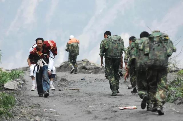 ▲2008年5月13日,北川中学学生李阳在武警官兵的帮助下救助自己的同学。大三时李阳选择参军入伍,他说要当个好兵,为家乡人民争气。