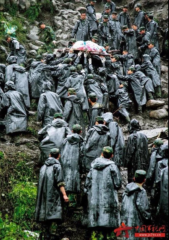 ▲令人难忘的照片《众志成城 托举生命》。山体垮塌,乱石滚成了陡坡,一条转移被困人员的必经之路被埋,再加上泡了一天一夜的雨,泥泞难行。在转移被困人员时,救援官兵用身体搭起人梯,把生命高高举过头顶。