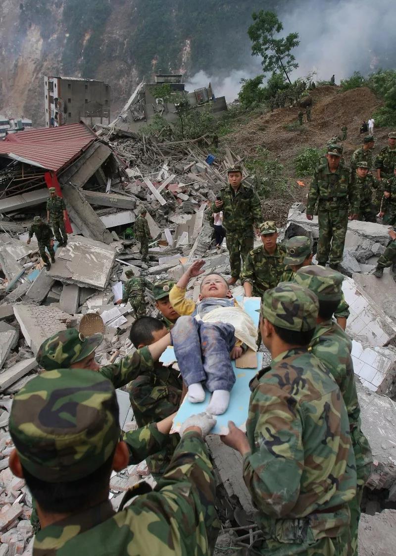 ▲2008年5月15日,绵竹市汉旺东汽中学,灾难过去80个小时,男孩终于被救援人员抬出废墟。他说,“叔叔,我想喝可乐”。