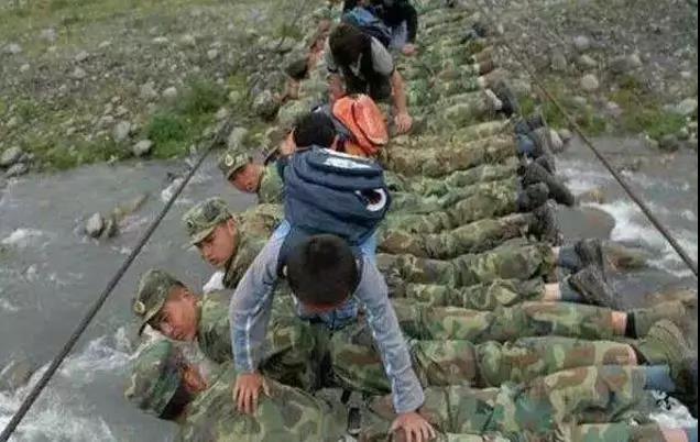 ▲2008年6月,四川省地震灾区彭州市湔江河边,战士趴在还没有修完的铁索桥上,组成临时的“人桥”,让小学生们从自己的脊背上爬过。