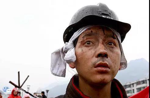 ▲一位头部受伤、满脸血迹的救灾人员在四川德阳地区的绵竹市救灾现场。