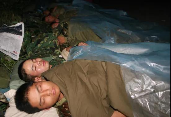 ▲2008年5月15日凌晨,参加抗震救灾的济南军区某部战士在汶川县映秀镇街头休息。