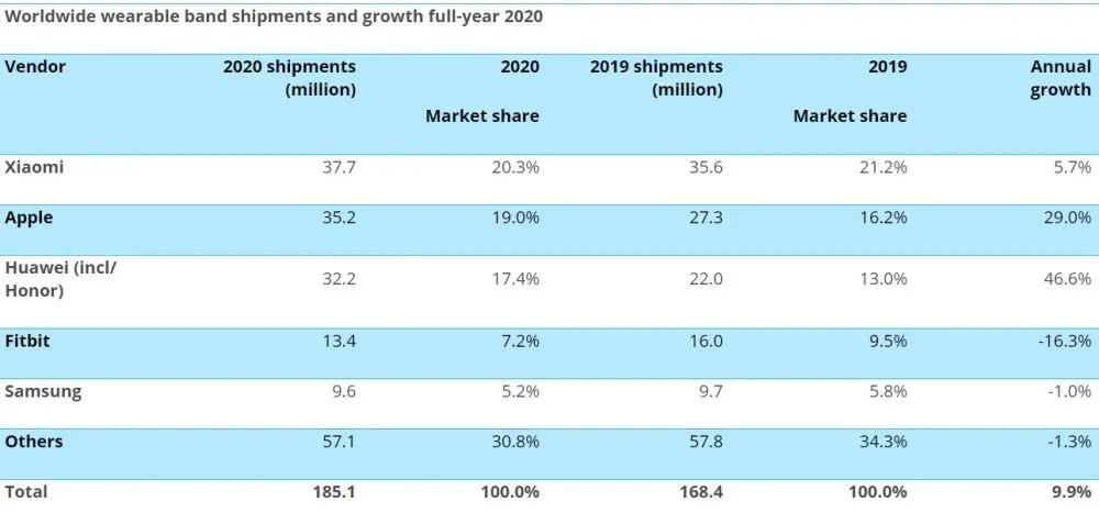 全球可穿戴设备市场在特殊的2020年经受住了考验,最终全年出货量为1.85亿件,同比2019年增长了9.9%,这算是一个还不错的成绩。