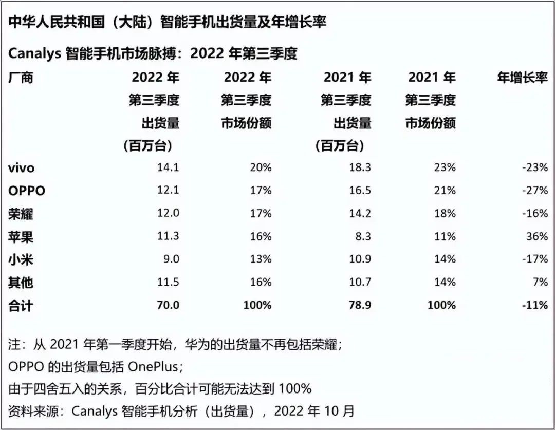 OPPO 2022年第三季度在中国智能手机市场出货量1080万台,同比下降27.9%,市场份额16.3%排名第三。