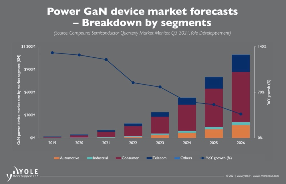 预计在2021年至2027年间,全球GaN功率器件市场的复合年增长率将达到30%,到2027年市场规模有望超过10亿美元,据行业预测,从2021年到2027年,全球GaN功率器件市场的复合年增长率(CAGR)预计将达到30%,并预计到2027年,其市场规模将超过10亿美元。这种增长的推动力主要源自电力电子设备的小型化和高效率化需求。由于GaN的物理特性,它能够为电力电子设备提供小型化和高效率化的解决方案。例如,GaN的低开关损耗和高工作频率能够显著提高电源的运行效率和功率密度,这在很大程度上推动了其在电源市场的应用。
