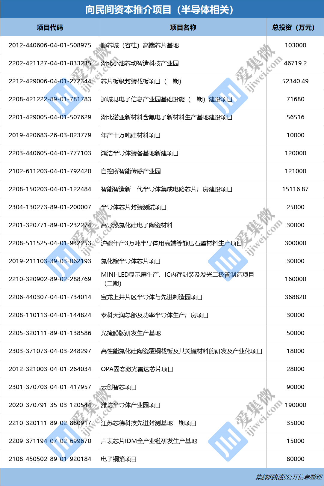 目前,半导体领域,平台向民间资本推介的项目约25个,项目总投资额超205亿元,主要集中在封装测试及相关材料领域,此外还包括“泰科天润总部及功率半导体生产厂房项目”、“光掩膜版研发生产基地”、“OPA固态激光雷达芯片项目”、“江苏芯德科技先进封测基地二期项目”等功率半导体、光掩模版、激光雷达芯片等重要热门方向项目。