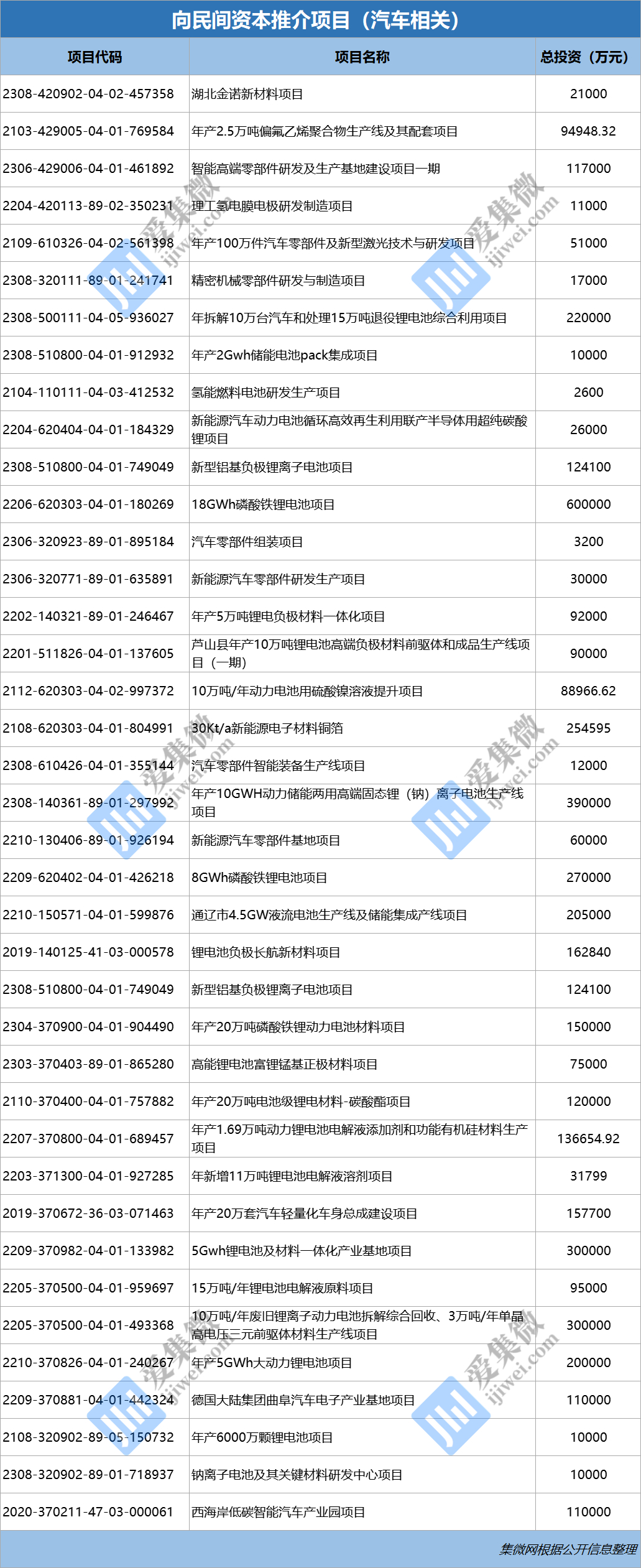 目前汽车领域,平台向民间资本推介的项目约40个,总投资额超488亿元,主要集中在锂电池材料、汽车零部件相关产品领域。