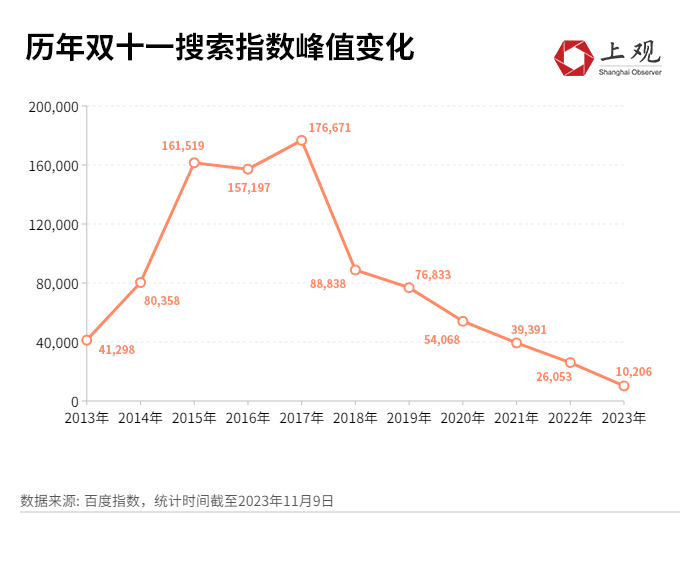 百度指数显示,“双十一”的热度是一年不如一年。其搜索量在2017年达到峰值,此后逐年下降。今年更是可以称为一个“冰点”,峰值搜索量较去年同期下降了60%,离曾经巅峰期的关注度更是差距甚远。