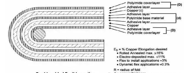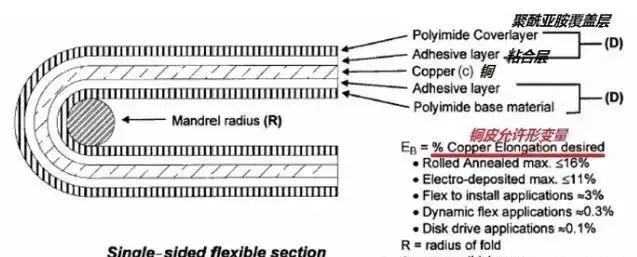 其中:R=最小弯曲半径、单位µm、c=铜皮厚度、单位µm、D=覆盖膜厚度、单位µm、EB=铜皮变形量,以百分数衡量。