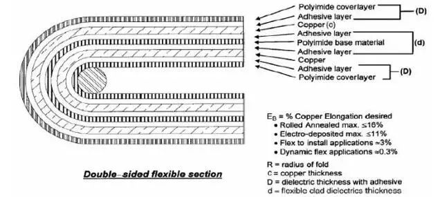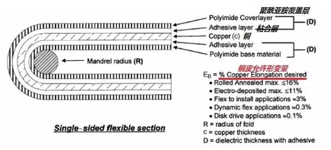 其中:R=最小弯曲半径、单位µm、c=铜皮厚度、单位µm、D=覆盖膜厚度、单位µm、EB=铜皮变形量,以百分数衡量。