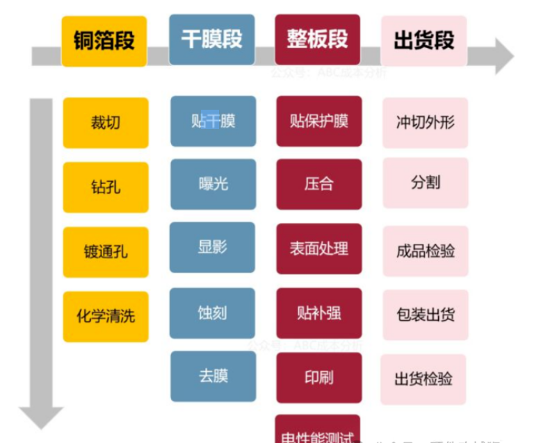 双面板:开料→ 烘烤→ 钻孔→ 黑孔 → VCP→ 前处理→ 贴干膜 →曝光→ 显影 → 蚀刻 → 脱膜 → 前处理→ 贴覆盖膜 → 压合 → 固化→ 表面处理→ 电测→ 装配 → 压合 → 固化→ 文字 →外形→ 终检→包装 出货