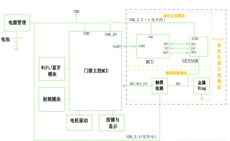 输出中断信号至主控 MCU,主控 MCU 被唤醒以后,对指纹识别模块上电,指纹识别算法