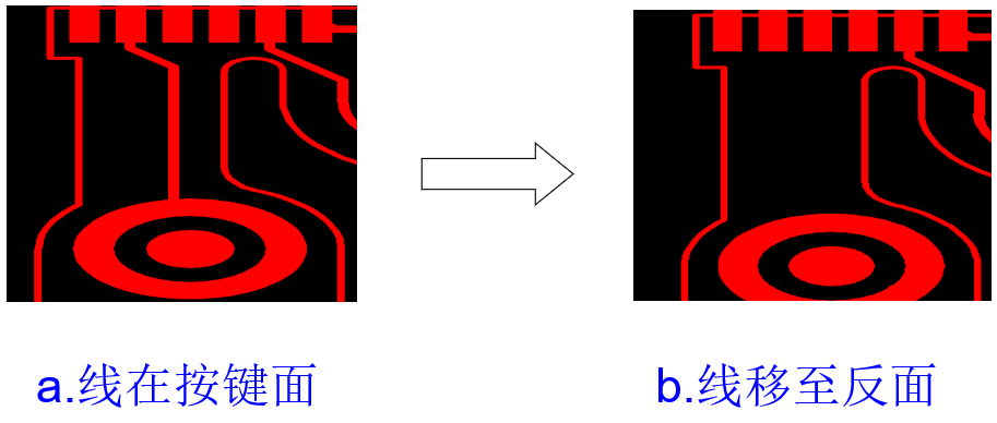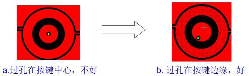 按键中心的过孔要移至边缘,不能在按键的中心,避免按键在使用中接触不良。按键分圆形按键和椭圆形按键两种,DOME片大小有3、4、5和3×3、3×4、4×5几种,FPC的键盘单边比dome片大0.3mm,FPC上的按键至少为3.6、4.6、5.6和3.6×3.6、3.6×4.6、4.6×5.6,若大小不够,要做相应补偿。