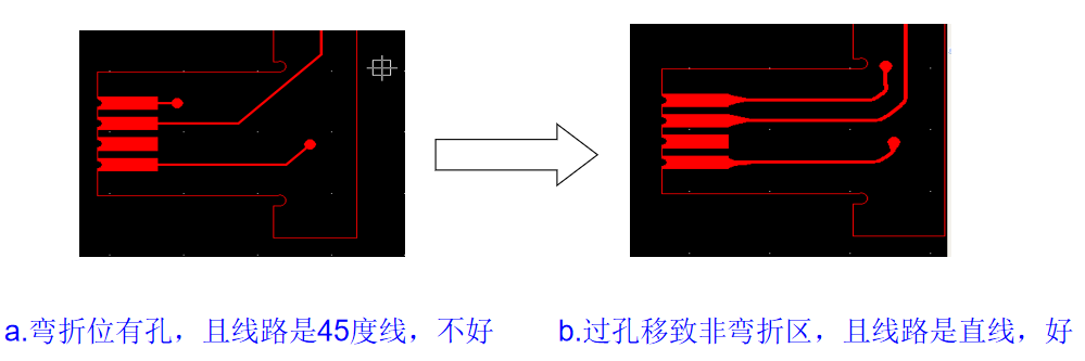 弯折区域的过孔要移到非弯折区域,以免弯折过程中孔破;弯折区域的线路以直线最佳,并把线路尽量加粗。
