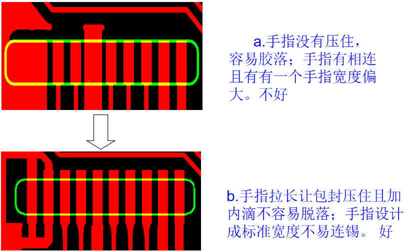 主键的连接器在允许的条件下,单边拉长0.2mm,让包封压住,且相连手指尽量修改成包封开窗外连接,接地手指做成和标准手指一样大,以免连锡,影响SMT质量。