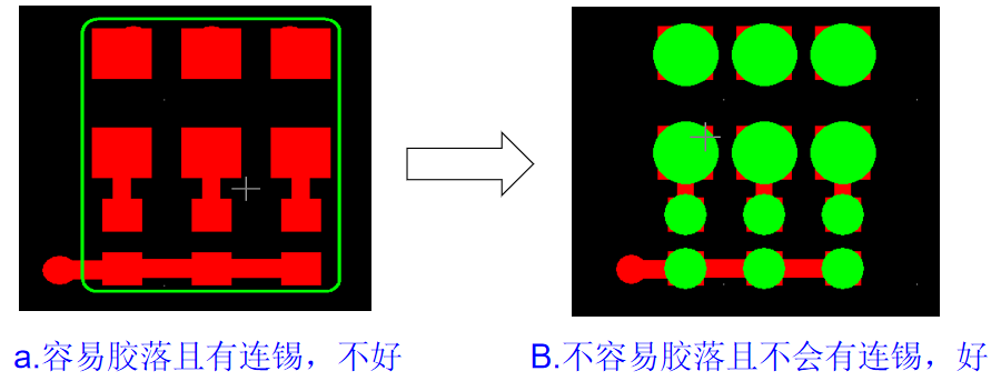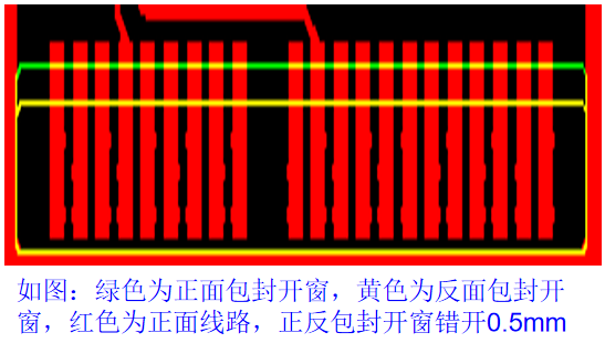 焊盘与焊盘有线的,尽量不要开通窗(特殊情况除外),以免造成连锡,影响SMT质量(如下图绿色为包封开窗)。