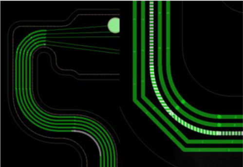 弧形角布线是对具有弯曲角而不是正交(45°)角的走线进行布线的能力。柔性电路板设计要求使用弯曲的走线对总线线路进行布线以减少应力,因此我们必须使用弧线进行布线。