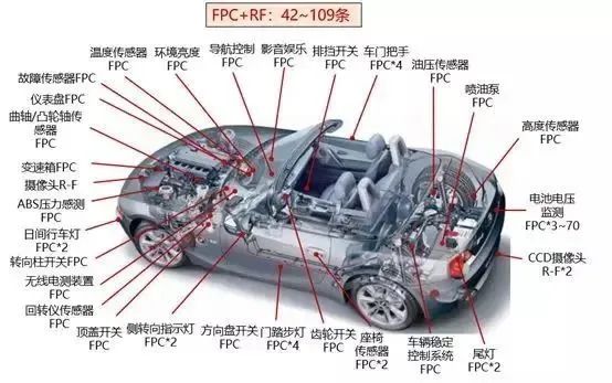 对于汽车而言,无论是燃油车辆,还是智能车辆都有FPC的应用,一般一辆电动汽车上会高达100多条的FPC应用,比如电池BMS、车辆照明系统、门控系统、摄像头模组等。