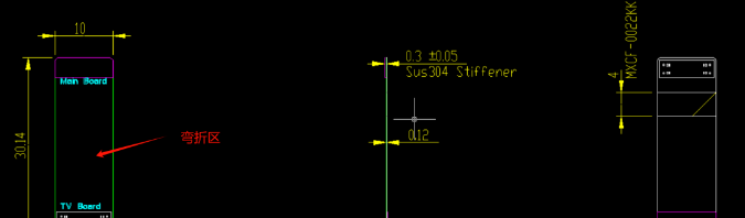 可以随意弯折是FPC软板的最大优势,因此它的弯折区要特别关注下,这是一个FPC项目中结构工程师给出的一个三视图图纸,这是一个副板连接主板的FPC排线,中间部分就是需要弯折的地方。