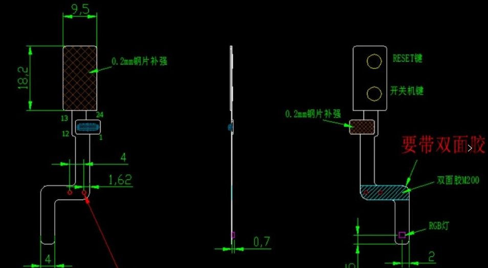 因为FPC软板很薄,一般双面板厚度0.08-0.13mm,如果在FPC上贴装连接器,就需要在连接器下板子的另外一面进行补强,如下图所示,结构给出的加工图纸中给出了补强区,在侧键和BTB连接的背面使用0.2mm的钢片进行补强设计。
