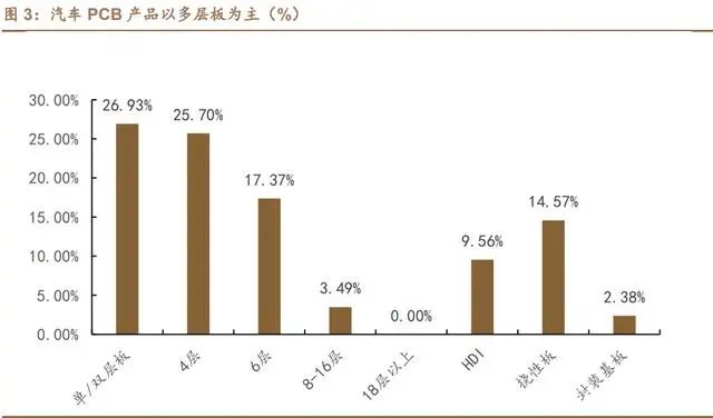 汽车 PCB 品类需求多元化,以为主。汽车对于 PCB 的要求是多元化 的,单双面板、4 层板、6 层板,8-16 层板分别占比 26.93%、25.70%、17.37%, 合计占比约 73%,HDI、FPC、IC 载板占比分别为 9.56%、14.57%、2.38%, 合计占比约 27%,可见 PCB 多层板仍是汽车电子的主要需求。车载 PCB 需求以 2-6 层板为主,在整车电子装置成本中的占比约为 2%左右。