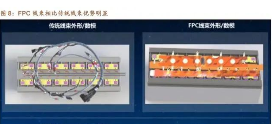 动力电池用 FPC:FPC 替代铜线线束趋势明确,PCB 单车价值约 600 元。采集线是新能源汽车 BMS 系统所需配备的重要部件,实现监控新能源动力 电池电芯的电压和温度;连接数据采集和传输并自带过流保护功能;保护汽车动 力电池电芯,异常短路自动断开等功能。此前新能源汽车动力电池采集线采用传 统铜线方案,空间挤占大,Pack 装配环节自动化程度低。相较铜线线束,FPC 由于其高度集成、超薄厚度、超柔软度等优点,在安全性、轻量化、布局规整等 方面具备优势。