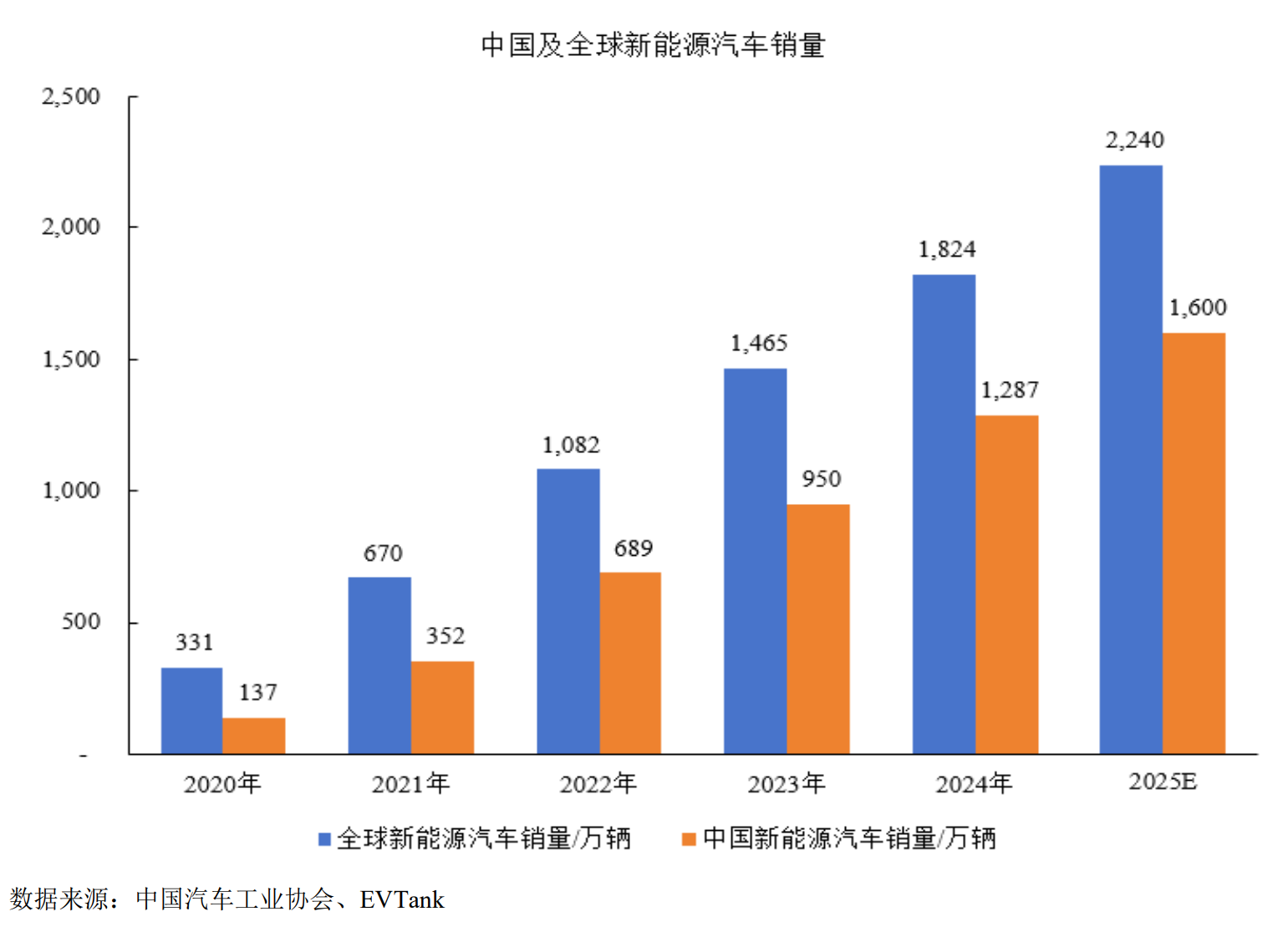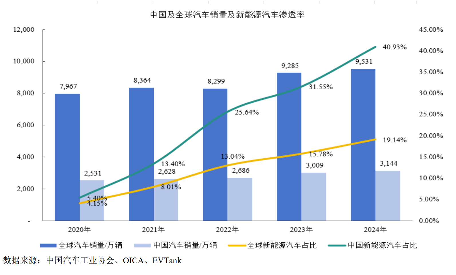 2024年度,全球及中国汽车销量分别为9,531万辆和3,144万辆,同比分别增长2.6%、4.5%,全球及中国新能源汽车产销分别为1,824万辆、1,287万辆,同比分别增长24.5%、35.5%,继续保持快速增长,新能源汽车销量占汽车总销量的比例分别达到19.1%、40.9%,中国成为引领全球汽车产业转型的重要力量。