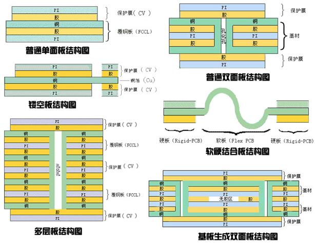 柔性印制电路板有单面、双面、多层板和软硬结合板之分。所采用的基材以聚酰亚胺覆铜板为主。此种材料耐热性高、尺寸稳定性好,与兼有机械保护和良好电气绝缘性能的覆盖膜通过压制而成最终产品。双面、多层印制线路板的表层和内层导体通过金属化实现内外层电路的电气连接。