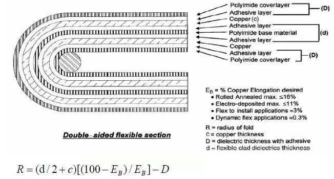 而且在不同的使用场合,同一材料的铜皮变形量取值也不一样。对于一次性弯曲的的场合,使用折断临界状态的极限值(对延碾铜,该值为16%)。对于弯曲安装设计情况,使用IPC-MF-150规定的最小变形值(对延碾铜,该值为10%)。对于动态柔性应用场合,铜皮变形量用0.3%。而对于磁头应用,铜皮变形量用0.1%。通过设置铜皮允许的变形量,就可以算出弯曲的最小半径。