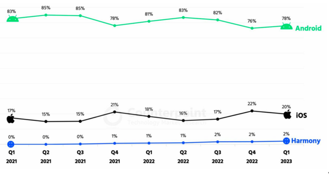 按照这份报告中公布的数据细节来看,安卓在今年第一季度的整体市场份额占比达到78%。虽然相较于去年同期有所降低,但仍旧以大幅度的领先优势占据了市场第一的位置。苹果的iOS市场份额占比在今年一季度达到20%,排名第二,相较于去年同期份额占比有所上涨。华为鸿蒙则在全球市场中占据了2%的份额,仅次于安卓和苹果。而就整体的份额增长趋势来看,鸿蒙在2021年第四季度全球市场份额突破1%,去年第三季度首次突破2%。