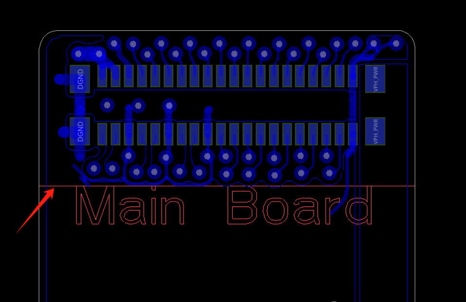 FPC设计中,对弯折区的要求很高,第一点就是弯折区内不能打孔,打孔会使弯折区铜硬度变大,影响弯折的效果和降低FPC寿命。如下图所示,箭头所指线以下为弯折区,BTB连接器的换层走线孔必须避开弯折区,不能在弯折区打孔。